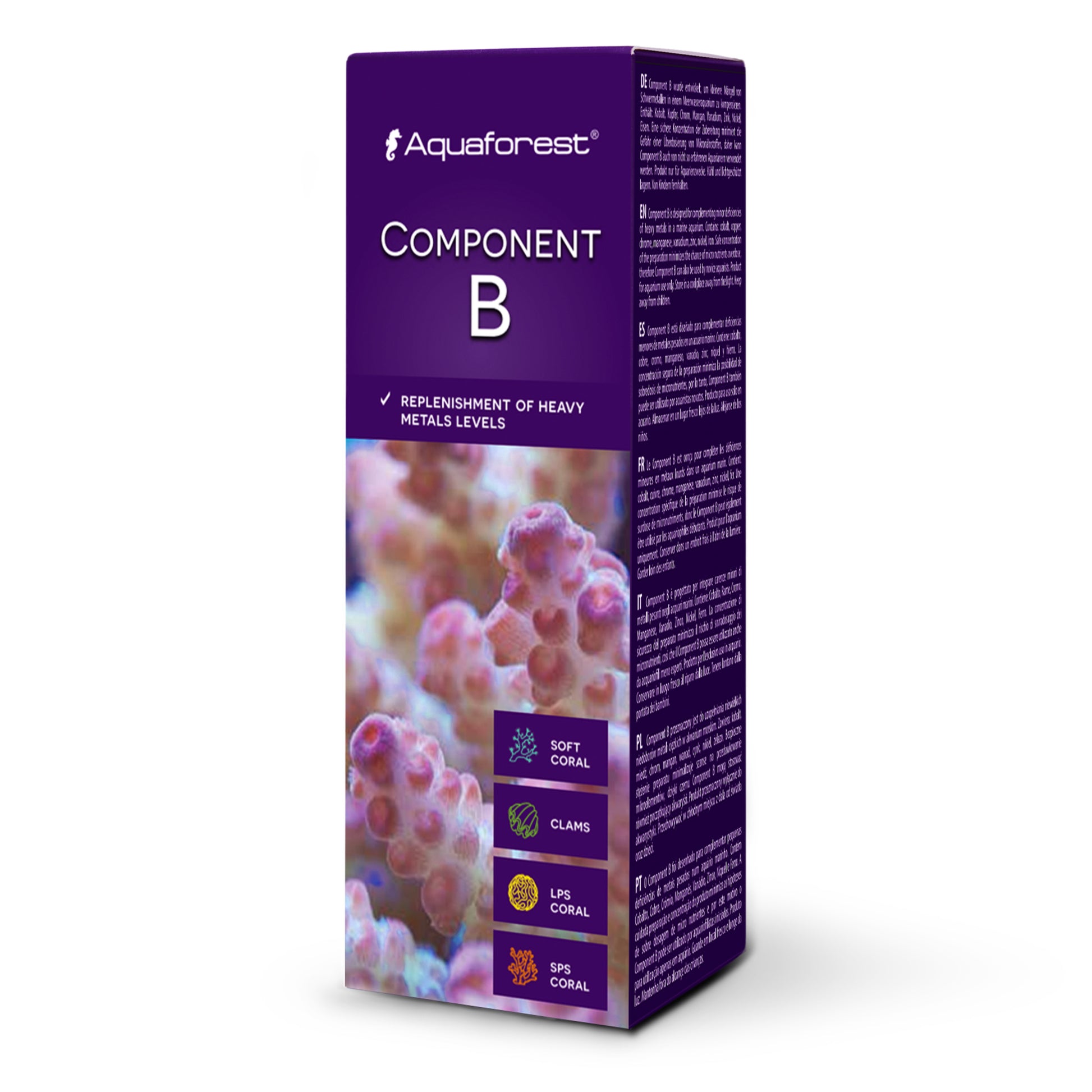 Il componente B è progettato per integrare piccole carenze di metalli pesanti in un acquario marino. Contiene: cobalto, rame, cromo, manganese, zinco, nichel, ferro. Gli skimmer e i mezzi di filtrazione tendono a rimuovere gli oligoelementi dall'acqua del sistema acquario chiuso, rendendo necessaria l'integrazione di micronutrienti. La composizione unica del preparato garantisce l'integrazione dell'acqua con metalli pesanti essenziali nell'acquario di barriera. Il componente B è stato progettato in base al rapporto tra gli elementi nell'acqua di mare naturale. Grazie all'integrazione di elementi cruciali, i coralli acquisiranno una colorazione intensa e rimarranno in condizioni fantastiche. La concentrazione sicura del preparato riduce al minimo la possibilità di sovradosaggio di micronutrienti, pertanto il Componente B può essere utilizzato anche da acquariofili alle prime armi.