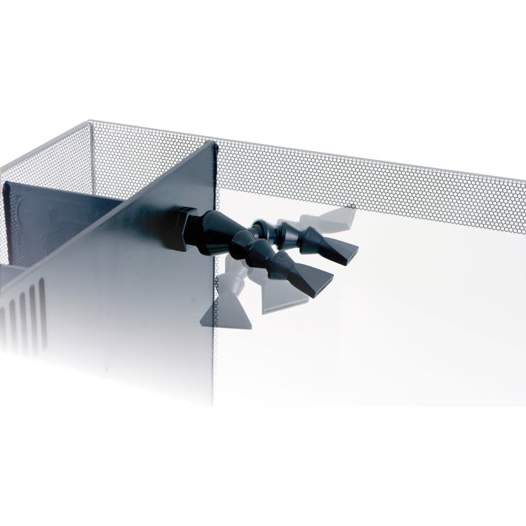 Un potente filtro a 3 stadi lavora per garantire una qualità dell'acqua costantemente eccellente. I mezzi necessari per la filtrazione meccanica (schiuma), chimica (carbone attivo) e biologica (Biomax) sono già inclusi. Si prega di notare che questi supporti devono essere sostituiti regolarmente. Si consiglia perciò di farne scorta. Il filtro ha due ugelli di uscita dell'acqua, i quali possono essere allineati in diversi modi per creare flussi d'acqua orientati. Il vano filtro si trova sul retro dell'acquario e si nota appena. Il design rimane quindi elegante con un tocco futuristico.